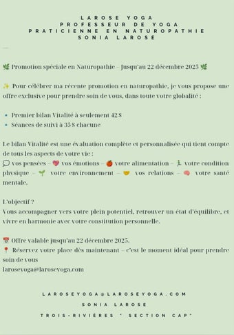 Chez Larose Yoga & Naturopathie, passionné par votre bien-être. Une approche holistique et personnalisée vous assure un accompagnement adapté à vos besoins uniques. Je vous aide à atteindre vos objectifs de santé et de bien-être.